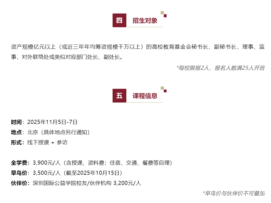 为此,深圳国际公益学院在2018年、2019年成功举办两期高校基金会秘书长高阶研修项目基础上,拟于2025年11月5日-7日在北京举办第三期高校基金会秘书长高阶研修项目。课程师资阵容强大,十余位分享人聚焦高等教育与公益慈善交叉场景,精准解决高校筹资与基金会治理过程中的关键问题,实操性、针对性强。课程包括公益慈善领域法律法规、税收政策及财务准则、新形势下高校筹资策略、高校基金会与社会公益力量协同路径等内容的讲解与分享,同时还将参访知名互联网企业公益基金会等机构。