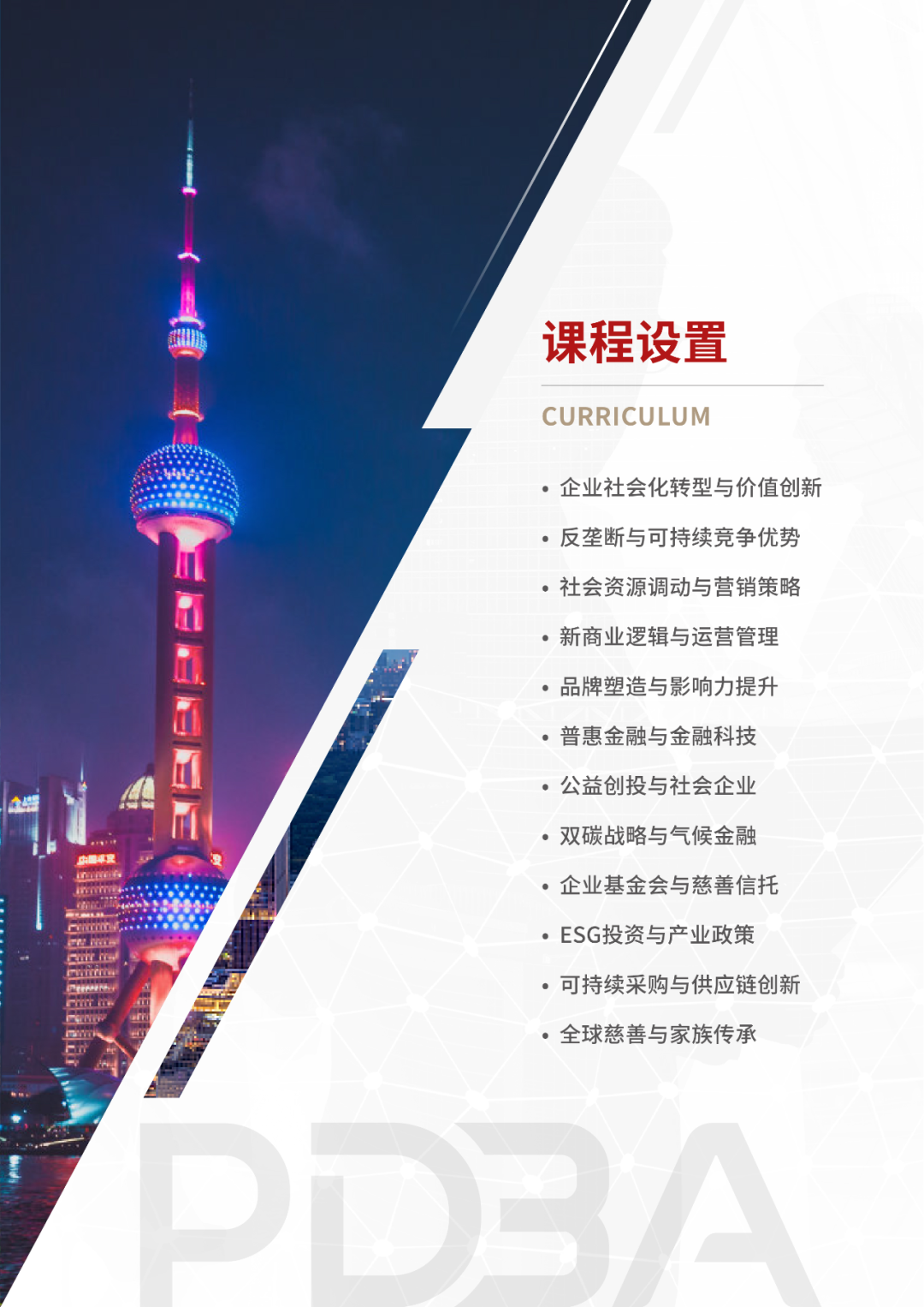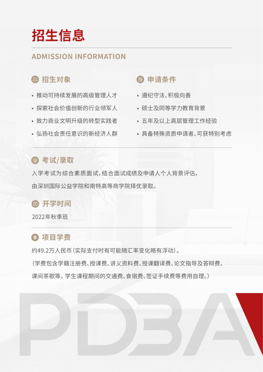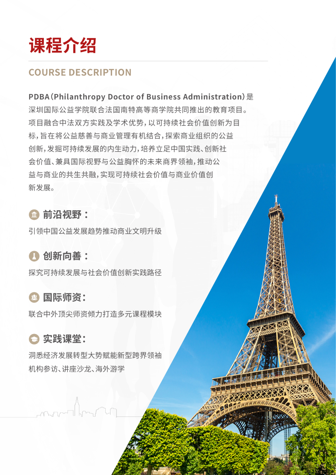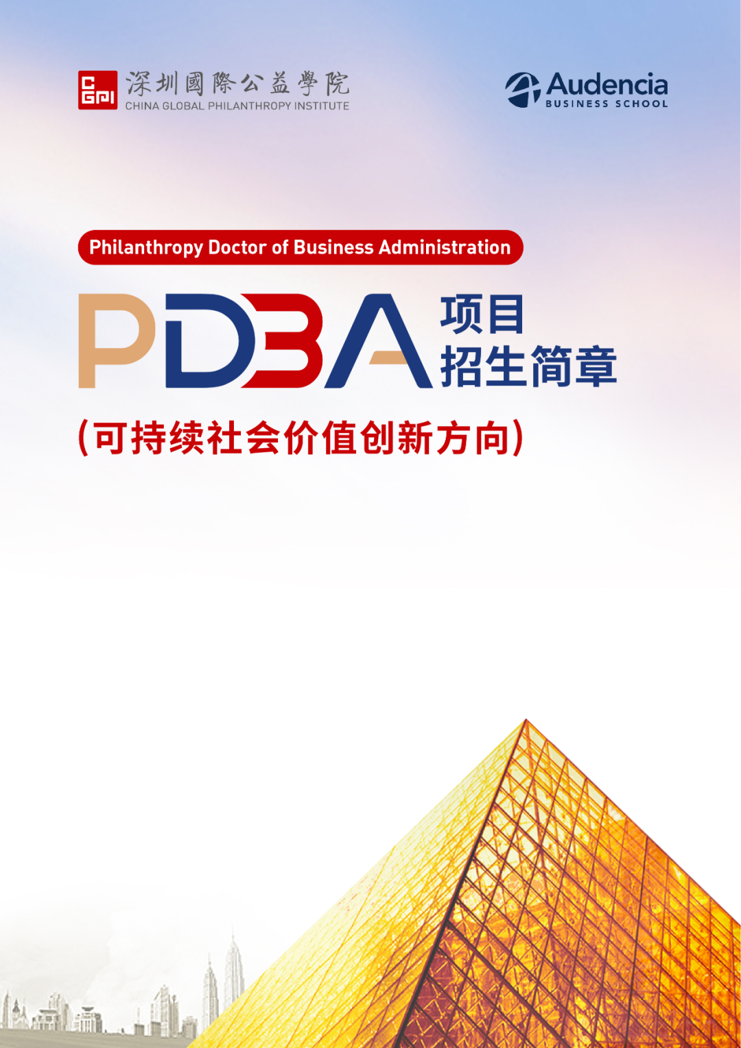 PDBA (Philanthropy Doctor of Business Administration) 是深圳国际公益学院联合法国南特高等商学院共同推出的教育项目。项目融合中法双方实践及学术优势,以可持续社会价值创新为目标,旨在将公益慈善与商业管理有机结合,探索商业组织的公益创新,发掘可持续发展的内生动力,培养立足中国实践、创新社会价值、兼具国际视野与公益胸怀的未来商界领袖,推动公益与商业的共生共融,实现可持续社会价值与商业价值创新发展。
